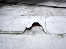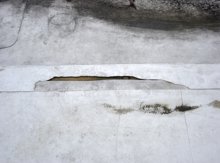 Mechanické poškození hydroizolačního povlaku je velmi masivní, hydroizolace je nejen poškozená rýhami v hmotě (jako nejmenším poškozením), ale kusy jsou i z ní vytržené.