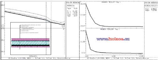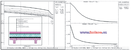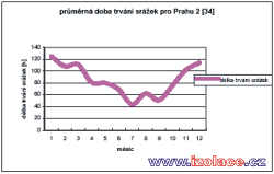Průměrné měsíční úhrny srážek a průměrná doba trvání deště pro Prahu 2, podle zprávy Českého hydrometeorologického ústavu [34]: po zpracování těchto údajů lze tedy sestavit průměrné intenzity v době trvání srážek. Z uvedené analýzy vyplývá, že nejvyšší zatížení srážkami s potencionálním nejvyšším podtékáním mezi deskami tepelné izolace a hydroizolací lze očekávat mimo hlavní topnou sezónu, resp. na jejích okrajích. Zřejmě tedy rozhodujícím zatížením z tohoto pohledu bude zatížení tajícím sněhem v období ledna, února kdy při náhlém oteplení vnějšího vzduchu celkem a povrchu střešního pláště slunečním zářením může docházet k odtávání sněhové vrstvy. Teplota vody vstupujícího tedy do předmětné mezivrstvy se bude blížit 0ºC. Nicméně množství a rychlost vody protékající touto mezivrstvou, nebo její poměr vzhledem k intenzitě srážek zatím není nikde specifikováno a bude zřejmě záviset na systému odvodnění střešního pláště, spádu a vřazených odporech a tření při průtoku mezivrstvou. 5. Vliv vlhkosti tepelné izolace na součinitel prostupu tepla konstrukcePro zhodnocení vlivu vlhkosti extrudovaného polystyrénu lze podle dostupné literatury [1] a na základě výzkumu BDA (Buro DakAdvise, Netherlands) použít vzorec: kde v...je objemová vlhkost materiálu [%]. 6. Analýza vlivu srážkové vody podtékající pod tepelnou izolací, v limitním teplotním stavu, na ochlazení vnitřního povrchu konstrukce a riziko vzniku kondenzace na tomto vnitřním povrchu při standardních podmínkách vnitřního prostředí – posouzení z hlediska neustáleného jednorozměrného teplotního stavuPředmětem této práce bylo i porovnat ochlazení jednotlivých variant konstrukcí a jejich vnitřních povrchů vlivem tohoto podtékání. Rozdílné chování bylo očekáváno u tzv. tepelně akumulačních nosných konstrukcí, jejichž hlavním reprezentantem byla vybrána železobetonová monolitická konstrukce tloušťky 20 cm s 5cm spádovou vrstvou z betonové mazaniny, dřevěného bednění, konstrukce z trapézových ocelových plechů, ve dvou variantách – klasické obrácené konstrukci, více méně teoretické, v praxi nerealizovatelné, a v tzv. DUO variantě s tepelnou izolací i pod hlavní povlakovou izolací. Určitým pokusem, do které skupiny bude nosná konstrukce zatříděna, byla varianta s nosnou konstrukcí tvořenou žebírkovými železobetonovými panely, resp. tenkou železobetonovou konstrukcí, s 3 cm vyrovnávacím cementovým potěrem. Pro tyto konstrukce byly nejdříve spočítány teplotní poměry v tzv. ustáleném teplotním stavu v limitních okrajových podmínkách z pohledu podtékání srážkové vody, tj. při teplotě exteriéru 0 ºC. Byla tak určena ustálená teplota ve vrstvě mezi tepelnou a vodotěsnou izolací. Poté byla do výpočtu nestacionárního vedení tepla vložena tato základní ustálená teplota a simulován pokles teploty v předmětné mezivrstvě na 0 ºC při podtékající vodě z tajícího sněhu a jeho vliv na vnitřní povrchové teploty. Průběhy teplot v daných konstrukcích v závislosti na čase jsou uvedeny na následujících grafech: železobetonová nosná podkladní konstrukce tl. 20 cm s betonovou mazaninou tl.5 cm, tloušťka tepelné izolace z XPS 12 cm: