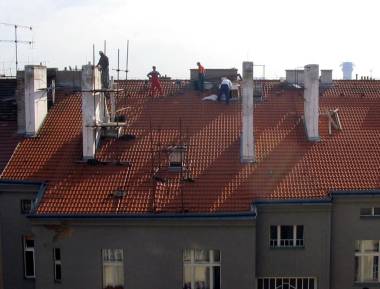 1. Úvod V popisovaném případě se jedná o vestavbu bytů do půdního prostoru starších cihelných bytových domů. Konstrukce krovu byla řešena ne zcela běžným způsobem, neboť kromě štítových sekcí byly na celém objektu použity prefabrikované železobetonové krokve. Právě těchto konstrukčních prvků pak použil architekt k výraznému ztvárnění podstřešních bytových prostorů s tím, že tepelně izolační vrstvu nově navrženého šikmého střešního pláště vložil mezi tyto železobetonové krokve, které tak vytvářely na podhledové ploše střešního pláště výrazný a charakteristický rastr. Objekt byl v prostoru nově vzniklých půdních bytů v podstatě standardním způsobem zateplen s použitím tepelně izolačních vláknitých desek, krytých sádrokartonem. Plocha střechy byla prolomena několika vikýři, v dalších částech bytu byla použita střešní okna. 2. Popis poruch střešního pláště Vzhledem k tomu, že právě v oblasti krokví bylo zvoleno dosti netypické konstrukční řešení podhledu a s ohledem na výrazně zhoršenou tepelně izolační schopnost železobetonových prvků s porovnáním s klasickými krokvemi dřevěnými bylo v první fázi předpokládané opravy střešního pláště nevhodné konstrukční uspořádání v oblasti krokví označeno za hlavní potenciální příčinu poruch, zvláště když bylo zjištěno, že část krokví, přesahující přes vnější líc obvodového zdiva do vnějšího prostředí je zcela neizolovaná. Proto také prvním požadavkem investora a přivolaného znalce bylo detailní prověření rozložení teplotních polí v oblasti krokve. Vzhledem k prostorovému uspořádání problematického detailu bylo rozhodnuto provést výpočtové posouzení trojrozměrného teplotního pole celé kritické oblasti konstrukce. 3. Výsledky podrobného průzkumu střešního souvrství Demontáž sádrokartonových desek umožnila odhalit zřejmě nejzávažnější závadu střechy, kterou bylo nekvalitní provedení tepelně izolační vrstvy. Tloušťka této vrstvy sice byla 160 mm, což je z pohledu stavební tepelné techniky hodnota zcela dostačující k tomu, aby zajistila dostatečně spolehlivou funkci střešní konstrukce. Tepelná izolace však byla tvořena pouze jednou vrstvou izolačních desek, takže nebylo možné desky uložit tak, aby došlo k prostřídání spár, což je běžná situace v případě, kdy je tepelná izolace tvořena dvěma vrstvami izolačních desek. V daném stavu vznikaly mezi jednotlivými izolačními deskami více či méně otevřené spáry, kterými pronikal vnější studený vzduch přes tepelně izolační vrstvu k vnitřnímu sádrokartonovému obkladu a jeho plechovým nosným profilům. Situaci navíc zhoršovala skutečnost, že drátové fixační kříže, které slouží ke stabilizaci tepelné izolace nebyly provedeny v patřičné hustotě a fixační dráty nebyly dostatečně napnuty. Tím docházelo k pronesení tepelně izolačních desek a následnému otvírání spár mezi těmito deskami. Také návaznost tepelně izolační vrstvy na okolní konstrukce nebyla zrovna silnou stránkou realizace střešního souvrství – v řadě detailů byla tepelná izolace ukončena ve vzdálenosti několika centimetrů od půdních nadezdívek, krokví, okenních rámů a podobně. Těmito nehomogenitami tepelně izolační vrstvy pronikal další studený vzduch přímo k vnitřnímu sádrokartonovému obkladu a byl tak bezprostřední příčinou velmi nízké vnitřní povrchové teploty této konstrukce a tím i příčinou vnitřní povrchové kondenzace vodní páry a následného vzniku plísňových kultur. Dalším nedostatkem projektového řešení byl fakt, že ve dvouplášťové šikmé střešní konstrukci s provětrávanou vzduchovou vrstvou pod střešní krytinou nebyla navržena difuzní folie. I když neexistuje žádné zákonné pravidlo, které by použití takovéto vrstvy ve střešním plášti předepisovalo, její nesporné výhody spočívají především ve vytvoření pojistné hydroizolační vrstvy, zvyšující hydroizolační bezpečnost střešního pláště a fungující v mimořádných situacích nebo při ztrátě vodotěsnosti střešní krytiny. Nezanedbatelná je i funkce difuzní folie jako větrové zábrany, jak ostatně ukazuje i popisovaný případ. V případě, kdy by byla difuzní folie ve skladbě zkoumaného střešního souvrství použita, by evidentně došlo jak ke snížení průvzdušnosti tepelně izolační vrstvy jako celku a tím i ke zlepšení funkčních vlastností střešního pláště, ale i k omezení pronikání studeného vzduchu do spár mezi tepelně izolačními deskami. Použití difuzní folie ve skladbě dvouplášťové šikmé střešní konstrukce má tedy zcela jednoznačné a jasné opodstatnění, spočívající především ve výrazném zvýšení funkční spolehlivosti konstrukce. Ke zjevným nedostatkům projektového řešení patří i absence nuceného větrání v prostorech s výraznými zdroji vodní páry. Jak v koupelnách, tak i v kuchyňských koutech bezprostředně navazujících na obývací pokoje se předpokládalo, že odvod vodních par bude zajištěn pouze přirozeným větráním okny. Pomineme-li skutečnost, že v zimním období je větrání koupelny oknem v době, kdy dochází k největší produkci vodních par prakticky nereálné, je přirozené větrání bezprostředně závislé na lidském faktoru a nemůže tedy zajistit optimální odvod vodních par jak z hlediska kvantitativního, tak i časového. Je proto nezbytné navrhovat v koupelnách i kuchyních systém nuceného větrání, ovládaného pokud možno automaticky pomocí vlhkostního čidla. V posuzovaném případě sice byly v několika kuchyních osazeny odsávače par, jednalo se však o zařízení cirk