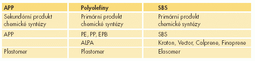 Asfaltové vodotěsné izolaceV současné době se používají tři základní druhy asfaltových vodotěsných izolací: oxidované asfalty, asfalty modifikované APP (ataktický polypropylen) a asfalty modifikované SBS (styren-butadien-styren). Asfaltové hmoty modifikované nestandardními modifikátory jsou objemově zanedbatelné. V našich klimatických podmínkách se dominantně používají materiály modifikované SBS, ale je nutné zmínit trendy zlepšování i dalších dvou druhů asfaltových materiálů. Vývojové trendyVšichni výrobci se snaží, aby se jejich materiály neustále vyvíjely, proto veškeré údaje, které jsou k dispozici, ukazují stav, který byl v době jejich sestavování. Kromě zkvalitňování vlastní asfaltové hmoty se klade důraz na zlepšování konstrukce izolačního materiálu – pásu (používáním stabilnějších vložek, odolnějších ochranných posypů, lépe zpracovatelných asfaltů atd.). Protože vložky, posypy, krycí fólie a další komponenty vyrábějí různí subdodavatelé, dochází i u nich k zlepšování parametrů. To platí zejména u výztužných vložek, kde je možno téměř libovolně upravovat napříkladprůtažnost či pevnost. Zlepšují se také kvalitativní parametry linek a snižuje se rozptyl docilovaných výsledných vlastností. K tomu dominantně přispívá moderní regulace a měření a přístrojová kontrola výroby. Tab. 1 - Přehled používaných modifikací asfaltových hmot