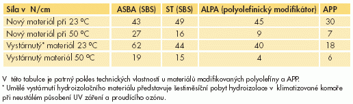 APP modifikátoryJedním z výrazných problémů u asfaltových materiálů modifikovaných APP je delaminace ve spojích. To je způsobeno rozmícháváním směsi, kdy „mastný“ APP vystupuje na povrch a postupně snižuje pevnosti spojů až k jejich absolutnímu rozdělení. Tato vada se projevuje u současných APP modifikovaných materiálů, při jejichž výrobě se používá modifikátor v blocích, který se obtížně rozmíchává do hmoty, a tím i obtížněji s ní spojuje. Tento modifikátor má tendenci vytvářet nehomogenní hmotu, u které je výrazná šance na oddělování asfaltu od modifikátoru. Důsledkem je zmýdelňování spojů, tj. modifikátor vystupuje na povrch a při stárnutí vytváří tenkou separační vrstvičku na styku pásů. Tím se pevnost pásů ve spojích oslabuje a při mechanickém zatížení – tahu nebo cyklickém zatížení např. sáním větru postupně dochází ke ztrátě těsnosti spojů. Při zkoušce pevnosti hydroizolačních materiálů ve svaru (tzv. peel testu) dochází k dramatickému snižování pevnosti. (V tomto případě byl použit test v trhání pod 180° při rychlosti 200 mm/min.) Druhým důsledkem je snižování pevnosti v přídržnosti na kovové prvky, zejména klempířské detaily. Tab.2 - Srovnání některých vlastností asfaltových hmot Tab. 3 - Trendy zlepšování některých vlastností asfaltových hmot Na obrázcích je patrné oddělení jednotlivých pásů, které je způsobeno právě zmýdelňováním spojů, protože se jedná o APP materiál. Je potřeba říci, že jednotlivé pásy byly spolehlivě k sobě svařeny, ale při stárnutí došlo k uvedenému jevu. Aby se tento stav vyloučil, nebo alespoň výrazně zpomalil, bylo nutné zajistit lepší homogenitu asfaltové hmoty. Nyní používaná modifikace APP již není v blocích, ale v granulích a je možné dosáhnout daleko lepší homogenity než dříve. To znamená, že u kvalitních materiálů modifikovaných APP lze očekávat výrazně vyšší životnosti než dříve. Tab. 4 - Srovnávací tabulka výsledků peel testu pro nové a vystárnuté materiály