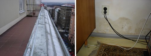 Tak, jak to vlastně je? Může tato srážková voda z vnějšku zábradlí podtéci hydroizolaci terasy a vniknout zdivem do bytu? Vyloučeno to není a jsem tam, kde na začátku. Někde tu teče… |