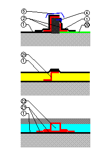c) 1 – hydroizolace 21 – přepážka z asfaltového pasu obdobného jako hydroizolační povlak 22 – hranol z extrudovaného polystyrénu