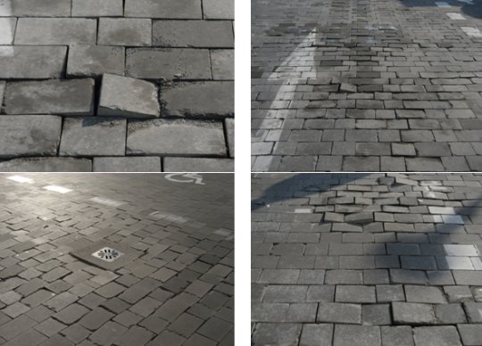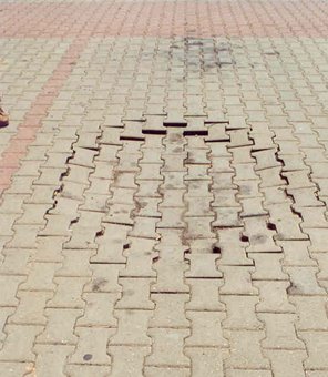 Obr. č. 5 – Povrch zámkové dlažby, kde došlo k úniku ropných produktů U pojízdných střešních plášťů je velmi důležité si uvědomit, že může dojít k úniku ropných produktů, které pak působí destruktivně na materiály a konstrukční prvky pojížděného střešního pláště. Jedním z velmi důležitých prvků těchto střešních plášťů je odvodnění. Toto odvodnění má určitá specifika, která je nutno evidovat a přizpůsobit jim užívání. Platí následující zásady: