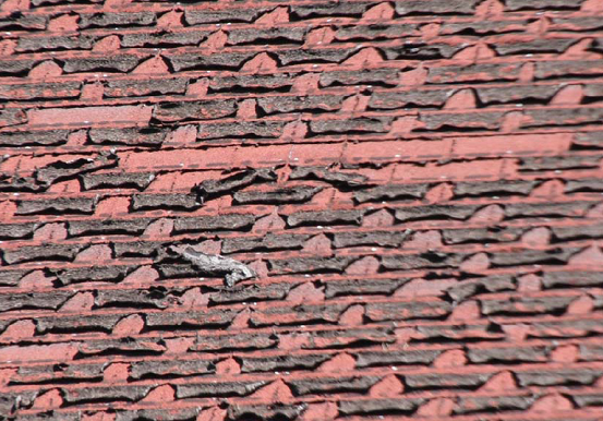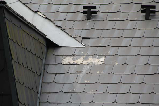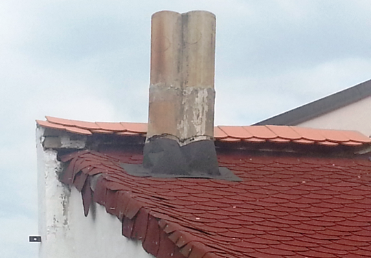 Opravdu na takovém konstrukčním řešení, včetně komínu, je možno oči nechat. V tomto případě byly použity kvalitnější šindele, ale kvalitě střechy to stejně moc nepomohlo. Dalším příkladem kvalitní krytiny jsou tyto vláknocementové šablony. Kromě toho, že tento snímek byl pořízen v podhorské oblasti, není možné vyloučit destrukci takovýchto střešních plášťů ani v nížinách.