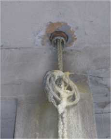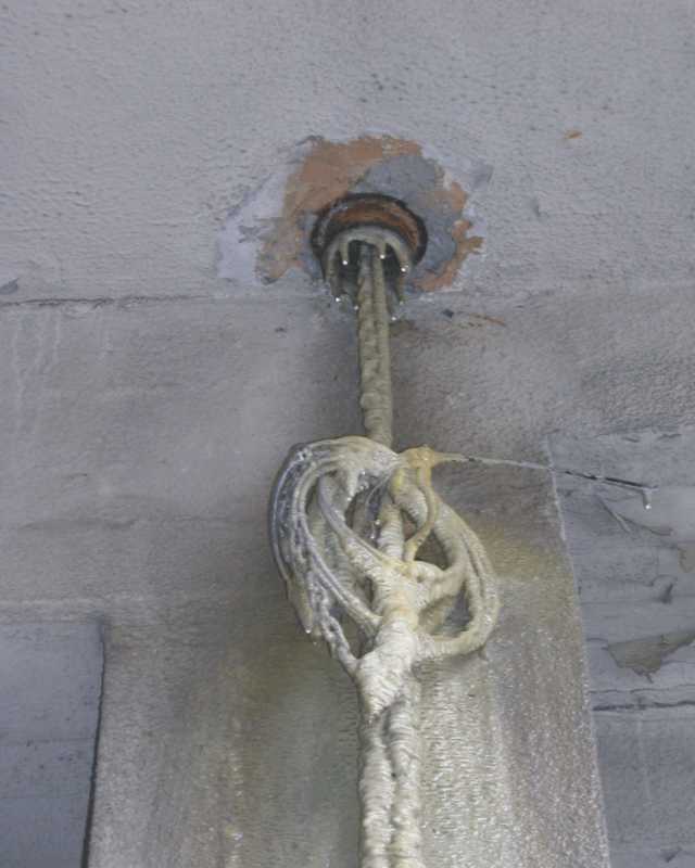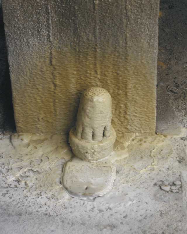 Návaznost na kanalizaci u paty sloupu, kde jsou opět patrné usazeniny z vylouhovaného betonu |