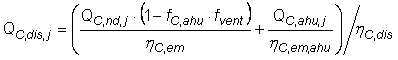 kde QC,nd,j je potřeba energie na chlazení v j-tém měsíci [GJ], fC,ahu je podíl potřeby chladu dodávaný VZT jednotkami [-], fvent je podíl času se spuštěným mechanickým větráním [-], hC,em je účinnost sdílení chladu mezi chlazeným prostředím a koncovými prvky chladící soustavy [-], QC,ahu,j je část potřeby energie na chlazení dodávaná do zóny v j-tém měsíci VZT jednotkami [GJ], hC,em,ahu je účinnost sdílení chladu mezi chlazeným prostředím a VZT vyústkami [-] a hC,dis je účinnost systému distribuce chladu [-]. Analogie s vytápěním je zřetelná rovněž ve výpočtu potřeby energie na chlazení: