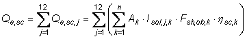 kde n je počet solárních kolektorů, Ak je plocha solárního kolektoru [m2], Isol,j,k je množství dopadající sluneční energie na k-tý kolektor v j-tém měsíci [GJ/m2], Fsh,ob,k je korekční činitel stínění k-tého kolektoru pevnými překážkami [-] a hsc,k je celková účinnost získávání energie v k-tém solárním kolektoru [-]. Celková roční produkce energie fotovoltaickými články Qel,PV se stanoví velmi podobně: