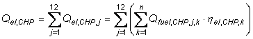kde n je počet fotovoltaických článků, Ak je plocha k-tého fotovoltaického článku [m2], Isol,j,k je množství dopadající sluneční energie na k-tý FV článek v j-tém měsíci [GJ/m2], Fsh,ob,k je korekční činitel stínění k-tého FV článku pevnými překážkami [-] a hPV,k je celková účinnost získávání elektřiny v k-tém FV článku [-]. A konečně celková roční produkce energie kogeneračními jednotkami Qel,CHP se stanoví ze vztahu