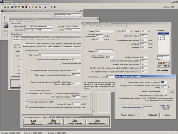 Obr. 1 Zadávací formuláře programu Energie 2008 s pomocným výpočtem Software Energie 2008 je novou verzí již 8 let existujícího programu. Program dosud umožňoval výpočet potřeby energie na vytápění podle již neplatné vyhlášky 291/2001 Sb. a výpočet průměrného součinitele prostupu tepla podle ČSN 730540. Nově umožňuje výpočet celkové roční dodané energie zahrnující spotřebu energie na vytápění, chlazení, přípravu teplé vody, úpravu vlhkosti vzduchu, mechanické větrání, osvětlení a pomocná zařízení. V energetické bilanci program zohledňuje i produkci energie v solárních kolektorech, fotovoltaických článcích a v kogeneračních jednotkách. Z vypočtené celkové roční dodané energie lze následně stanovit množství primární energii a velikost emisí CO2. Samotný výpočet lze v programu provést několika metodikami. Podporován je výpočet se sezónním krokem (pro jednodušší, jen vytápěné budovy), s měsíčním krokem podle vyhlášky 148/2007 Sb. a s měsíčním krokem pro nízkoenergetické domy podle nově připravované metodiky prof. Ing. J. Tywoniaka, CSc.