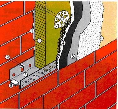 1. stěrkové lepidlo 2. minerální izolační deska z nehořlavých hmot (třída reakce na oheň A1 nebo A2) 3. hmoždinka s příchytným talířem 4. výztužná síť 5. penetrační mezivrstva 6. omítka 7. fixační soklová lišta 8. spoj soklové fixační lišty 9. ukotvení soklové fixační soklové lišty