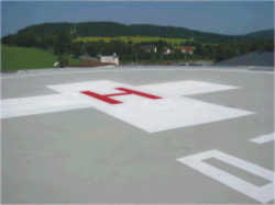 Akce: heliport; Velice zajímavá aplikace v systému polyuretanových izolací je uplatnění izolační povrchové úpravy pro poměrně netradiční zatížení – vzlet, přistávání a další manipulace vrtulníku a další speciální techniky v rámci nemocničního provozu. Systémem CONIDECK B-F investor vyřešil dva problémy najednou, a to jak velice trvanlivou a pružnou izolaci střechy, tak zároveň vysoce odolnou povrchovou obrusnou vrstvu pro vysoké mechanické zatížení.