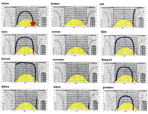 Zasklení Zvolené zasklení má solární faktor 36%, tzn. celková propustnost sluneční energie je 36%. Činitel prostupu světla tímto zasklením je 0,46, kromě prostupu sluneční energie je tedy značně snížen i prostup světla. Slunolamy Pro správný návrh slunolamů je zapotřebí uvědomit si polohu slunce nad obzorem pro jednotlivé orientace fasády a pro jednotlivá roční období. Objekt se nachází na rovníku, je tedy zapotřebí počítat s faktem, že půl roku slunce svítí ze severu, půl roku z jihu. Výška slunce nad obzorem je po celý rok téměř vyrovnaná, doba přímého slunečního svitu je také během celého roku prakticky shodná. Doba oslunění a dráha slunce na obloze je patrná z následujícího obr. č. 1.  Obr. 1 Dráha slunce pro jednotlivé měsíce. Z průběhu slunečních drah je patrné, že východ i západ slunce je poměrně rychlý, po celý rok se slunce pohybuje poměrně vysoko nad zenitem. Z toho vyplývá, že ideálním pasivním stínicím prostředkem je horizontální slunolam a to víceméně po celém obvodu budovy. Z architektonického hlediska byl v případě řešené budovy zvolen slunolam s proměnnou hloubkou vyložení. Účinnost slunolamu ve vybraném místě na jižní fasádě s největší hloubkou jeho vyložení je patrná z následujících obr. č. 2.  Obr. 2 Účinnost vodorovného slunolamu.