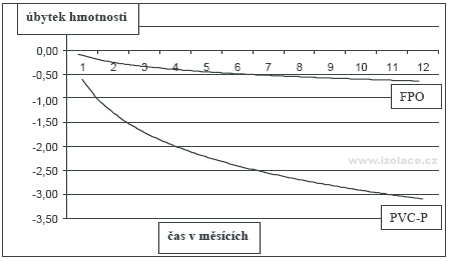 Odolnost mikroorganismůmZ grafu je patrno, že dochází k úbytku změkčovadel, které spotřebovávají mikroorganismy. Existuje však ochrana a to tím, že do PVC-P se přidávají fungicidy, které ničí mikroorganismy.