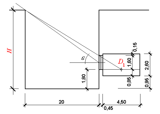 2. Modelové ověření Výše uvedenou „zkoušku“ jsem pokusně provedl v podmínkách obytné místnosti běžných půdorysných rozměrů 4,5 x 3,0 m, světlé výšky 2,6 m, s oknem v ose místnosti šířky 2,0 m a výšky 1,6 m a s parapetem 0,85 m. Zbývá tak nadpraží 0,15 m. Okno je stíněno protější řadou domů v ulici, která má šířku 20 m a výšku zástavby H (m). Předpokládá se obytná místnost v nejnižším nadzemním podlaží s výškou parapetu 1,8 m nad úrovní chodníku. Přístup oblohového světla by neměl být rušen alespoň od středu obytné místnosti, čemuž odpovídá úhel . Maximální výška zástavby pro tento případ vychází