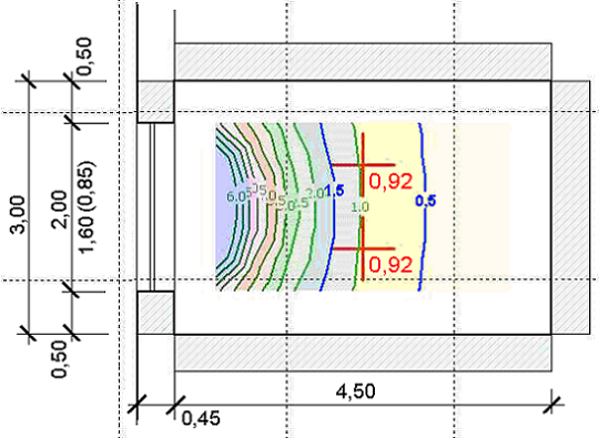 Obrázek 4: Místnost stíněná zástavbou výšky H = 45 m