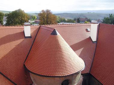 Tvrz v Litenčicích u Kroměříže existovala již ve druhé polovině 14. století. Na barokní zámek byla přebudována v roce 1667. V druhé polovině 18. století odkázal poslední potomek rodu Thonsernů František Josef celé panství Františku Maxmilánu Podstatskému. Podstatští-Thonsernové drželi Litenčice do roku 1948. Zámek s přilehlými budovami potom přešel do rukou státu, který v něm zřídil učiliště. Na další devastaci se podílelo Technické muzeum Brno, které nerealizovalo plánovanou expozici zemědělských strojů. O historii a zejména současné rekonstrukci zámku jsme hovořili s jejím zatím posledním majitelem Ing. Richardem Podstatzkým, který může užívat i šlechtický titul baron. Jako správný hospodář začal s rekonstrukcí objektů od střech. Nad složitým krovem pozdně barokní konstrukce hlavní budovy, tzv. velkého zámku, byla v havarijním stavu pálená krytina bobrovka, stejně jako na střechách severního křídla, tzv. malého zámku a jižního křídla, zámecké knihovny a věže se zámeckou kaplí. V severním křídle byl krov vaznicový a sedlová střecha. V jižním křídle byl krov starší hambálkové soustavy, věž měla střechu valbovou. Po restituci v roce 1993 začala baronka Marie Podstatzká, maminka Richarda, s podnikáním v oboru lesní a rostlinné zemědělské výroby. O rok později začaly zmíněné postupné rekonstrukce střech, bez státní dotace. K tomu Ing. Podstatzký dodává: „Na historických střechách v předzámčí a statku byla původní pálená kritina nahrazena betonovu taškou Bramac Alpská cihlově červená. V roce 2003 se uskutečnila rekonstrukce střechy čtyřkřídlé budovy velkého zámku, kde byla položena bobrovka Bramac cihlově červená. Nutno připomenout, že stát se podílel dotacemi z Havarijního programu ministerstva kultury a Zlínský kraj svým Fondem kultury. V konečném součtu to bylo pokrytí poloviny nákladů, druhou polovinu hradila naše rodina. Rád bych zdůraznil, že krov je původní z roku 1667, jen některé trámy musely být vyměněny a některé prvky chemicky ošetřeny proti dřevomorce a dřevokaznému hmyzu. Na řadu přijde oprava levého křídla včetně výměny oken a zhotovení nových dříve původních venkovních vápenných štukových omítek. V nedaleké budoucnosti zprovozníme penzion pro loveckou turistiku ve zdejší honitbě.“ K úplné informaci chybí údaje z realizační firmy, která na rekonstrukci střech má lví podíl. Hned to napravíme – pokrývačské a klempířské práce se značkou nejvyšší kvality udělala firma Pokrývačství Pavla Lakomého z Olomouce. Že jde o vskutku povedené dílo svědčí i první místo v 15. ročníku celostátního Pokrývačského mistrovství Bramacu, v kategorii Historické objekty. Od tohoto faktu už byl jen krůček k popovídání si o průběhu pokrývačských a klempířských pracích na střechách litenčického zámku. „Volba krytiny Bramac vyřešila kromě jiného i problém místních povětrnostních podmínek,“ řekl úvodem dvojnásobný vítěz Pokrývačského mistrovství Pavel Lakomý a pokračoval pro pořádek nejdříve několika větami o své firmě: „Začínali jsme tři společníci v roce 1990 ve stavební firmě. Osamostatnil jsem se o dva roky později s náplní práce dodávky a montáže střešních plášťů. Klempířské práce přibyly od roku 1997. Nyní firma čítá tři až pět zaměstanců. Disponujeme kompletním vybavením včetně výtahů na střechy a klempířskou dílnou s příslušnými stroji a nástroji. V současnosti se specializujeme na památkové objekty, kde nejsou potřebné jen montážní práce, ale i výroba replik, kotlíků, chrličů a jiných náročnějších klempířských prvků.“ Když jste se zmínil o památkových objektech, které další jsou renovovány vaší firmou? „Je to zámek v Bludově u Šumperka, kde měníme starou eternitovou krytinu za novou přírodní břidlicovou. Nyní je položeno dva tisíce pět set metrů čtverečných na křídle od parku, což je jedna třetina celkové plochy střech. V přípravě máme střechy zámku ve Zdounkách na Kroměřížsku. Dáme tam bobrovku, ale ještě není vyřešeno, zda pálenou nebo betonovou.“ Je nejvyšší čas se vrátit do Litenčic a odborně pohovořit o průběhu zmíněné rekonstrukce. „Nejdříve se začalo s opravou přilehlých hospodářských budov, aby tam bylo možné začít podnikat. Co se týká střech, tak byla nutná kompletní oprava všech střešních plášťů, která se děla postupně a loni byla dokončena. V konečném součtu i s hlavním zámkem, je to 6 284 m2 zastřešené plochy. Postup prací byl následovný: demontovali jsme starou krytinu, vyspravili poškozené vyhnilé části vazby, srovnání, pokud to šlo, proběhlo přímo na vazbě na stolici. Potom jsme dělali laťování dílem na kontralatě, kde byly půdní prostory následně využívány a dílem volně na krokve. Podle potřeby jsme položili difúzní fólii nebo lepenku. Při pokládání tašek jsme zvažovali vyskládat úžlabí, ale nakonec jsme použili plech. Podle velikosti sklonu jsme bobrovku upevňovali na sponky nebo přibíjeli. K tomu připočtěme veškeré klempířské prvky na hlavním zámku z mědi, jinde z pozinkovaného plechu. Všechny záludnosti a náročné postupy jsme zvládli k plné spokojenosti majitelů zámku i odborné poroty výše uvedené soutěže.“ (svo)