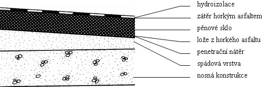 Velmi důležité je dodržení důsledné kompaktnosti celé skladby, které je docíleno vzájemným slepením všech vrstev horkým asfaltem. Pěnové sklo je celoplošně lepeno na podklad (v případě zatížených střech většinou betonový) do lože horkého asfaltu, spáry mezi jednotlivými deskami pěnového skla jsou zalepeny asfaltem a hydroizolační vrstva je celoplošně nalepena nebo navařena na asfaltem zatřený povrch pěnového skla (viz obr. 3).