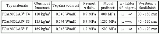 Tabulka 1: Technické parametry základních typů pěnového skla
