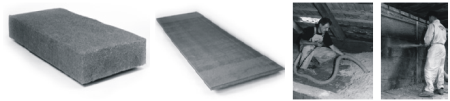 Obr. 5-8 - detail skladby obvodové stěny s tep. izolací ze slámy (vlevo). Rekonstrukce školy a přístavba tělocvičny, Allentsteig, Rakousko (vlevo uprostřed). Foto A. Brotánek. Novostavba pasivní mateřské školy, Ziersdorf, SRN s tepelnou izolací ze slámy a s hliněnými omítkami (vpravo uprostřed). Foto M. Vonka. Detail zateplení střechy RD slaměnými balíky, Říčany, ČR. 3.2.2 Využití technického konopí Jednou z mnoha aplikací technického konopí je průmyslová výroba tepelné izolace, která zahrnuje tvrzené desky pro akustické izolace podlah, stabilizované desky pro KZP a měkké rohože. Výrobky mají deklarovánu řadu stavebně fyzikálních vlastností [6], kromě základních (objemová hmotnost 24–42 kg/m3, součinitel tepelné vodivosti 0,040 W/(m.K), faktor difúzního odporu 1–2), také požární odolnost B2 podle DIN 4102-1, rozměrovou stálost, test odolnosti proti plísním, činitel zvukové pohltivosti αw = 1,00 při tloušťce 160 mm (podle DIN EN ISO 354), nasákavost ≤ 4,2 kg/m2, atd.