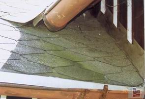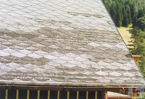 Plřiklad plešatění asfaltových šindelů na objektu podhorské chalupy: