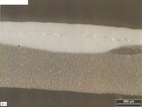 Mikrofotografie mPVC fólie s vrchní (na obrázku bílou) vrstvou, která je UV stabilizovaná. Domnívám se, že výše uvedené fotografie jsou pádným důkazem, že bezhlavé odstraňování sněhu ze střešních plášťů mže být velmi kontraproduktivní, že je možno nadělati více škody než užitku.