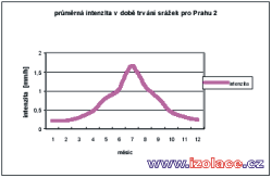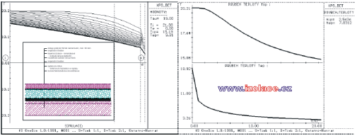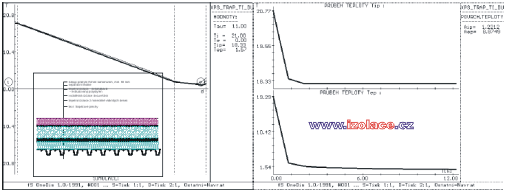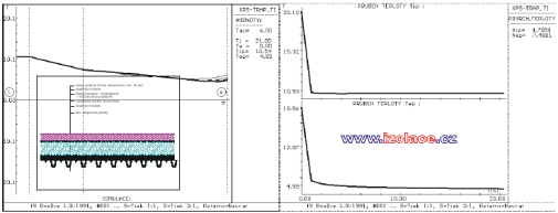Průměrné měsíční úhrny srážek a průměrná doba trvání deště pro Prahu 2, podle zprávy Českého hydrometeorologického ústavu [34]: po zpracování těchto údajů lze tedy sestavit průměrné intenzity v době trvání srážek. Z uvedené analýzy vyplývá, že nejvyšší zatížení srážkami s potencionálním nejvyšším podtékáním mezi deskami tepelné izolace a hydroizolací lze očekávat mimo hlavní topnou sezónu, resp. na jejích okrajích. Zřejmě tedy rozhodujícím zatížením z tohoto pohledu bude zatížení tajícím sněhem v období ledna, února kdy při náhlém oteplení vnějšího vzduchu celkem a povrchu střešního pláště slunečním zářením může docházet k odtávání sněhové vrstvy. Teplota vody vstupujícího tedy do předmětné mezivrstvy se bude blížit 0ºC. Nicméně množství a rychlost vody protékající touto mezivrstvou, nebo její poměr vzhledem k intenzitě srážek zatím není nikde specifikováno a bude zřejmě záviset na systému odvodnění střešního pláště, spádu a vřazených odporech a tření při průtoku mezivrstvou. 5. Vliv vlhkosti tepelné izolace na součinitel prostupu tepla konstrukcePro zhodnocení vlivu vlhkosti extrudovaného polystyrénu lze podle dostupné literatury [1] a na základě výzkumu BDA (Buro DakAdvise, Netherlands) použít vzorec: kde v...je objemová vlhkost materiálu [%]. 6. Analýza vlivu srážkové vody podtékající pod tepelnou izolací, v limitním teplotním stavu, na ochlazení vnitřního povrchu konstrukce a riziko vzniku kondenzace na tomto vnitřním povrchu při standardních podmínkách vnitřního prostředí – posouzení z hlediska neustáleného jednorozměrného teplotního stavuPředmětem této práce bylo i porovnat ochlazení jednotlivých variant konstrukcí a jejich vnitřních povrchů vlivem tohoto podtékání. Rozdílné chování bylo očekáváno u tzv. tepelně akumulačních nosných konstrukcí, jejichž hlavním reprezentantem byla vybrána železobetonová monolitická konstrukce tloušťky 20 cm s 5cm spádovou vrstvou z betonové mazaniny, dřevěného bednění, konstrukce z trapézových ocelových plechů, ve dvou variantách – klasické obrácené konstrukci, více méně teoretické, v praxi nerealizovatelné, a v tzv. DUO variantě s tepelnou izolací i pod hlavní povlakovou izolací. Určitým pokusem, do které skupiny bude nosná konstrukce zatříděna, byla varianta s nosnou konstrukcí tvořenou žebírkovými železobetonovými panely, resp. tenkou železobetonovou konstrukcí, s 3 cm vyrovnávacím cementovým potěrem. Pro tyto konstrukce byly nejdříve spočítány teplotní poměry v tzv. ustáleném teplotním stavu v limitních okrajových podmínkách z pohledu podtékání srážkové vody, tj. při teplotě exteriéru 0 ºC. Byla tak určena ustálená teplota ve vrstvě mezi tepelnou a vodotěsnou izolací. Poté byla do výpočtu nestacionárního vedení tepla vložena tato základní ustálená teplota a simulován pokles teploty v předmětné mezivrstvě na 0 ºC při podtékající vodě z tajícího sněhu a jeho vliv na vnitřní povrchové teploty. Průběhy teplot v daných konstrukcích v závislosti na čase jsou uvedeny na následujících grafech: železobetonová nosná podkladní konstrukce tl. 20 cm s betonovou mazaninou tl.5 cm, tloušťka tepelné izolace z XPS 12 cm:
