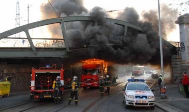 Jednalo se o opravu mostu zasaženého požárem, který vznikl od zkratu elektrického vedení trakčního vedení tramvaje s ocelovou konstrukcí mostu při zaklínění kamionu pod mostem. Všeobecné údaje o mostě Tento most převádí dvoukolejnou elektrifikovanou trať Praha hl.n. – Praha Smíchov přes Bělehradskou ulici v Praze 2. V r. 2001 byl tento most přestavěn. Původní ocelové konstrukce s prvkovou mostovkou, byly nahrazeny konstrukcemi s průběžným kolejovým ložem pod každou z kolejí. Most je navržen pro zatížení vlakem ČSD T a prostorově splňuje MPP 2,5R. Přímým důsledkem požadavku mostovky s průběžným kolejovým ložem byla přirozeně i vyšší stavební výška mostu, ve srovnání s původními konstrukcemi s prvkovou mostovkou, proto byla zdvižena niveletu koleje na mostě o přibližně 0,50 m, s výběhy v potřebném rozsahu na obou předmostích. Pod mostem vedou dvě tramvajové koleje, obousměrná komunikace a chodníky. Rekonstrukcí byla zvýšena podjezdná výška pod mostem o 150 mm, odstraněny původní mezilehlé podpěry v chodnících a celý prostor pod mostem se tak rozšířil a získal na přehlednosti i z hlediska dopravy. Požadavku výrazného snížení hladiny hluku, působeného provozem na mostě, se podařilo úspěšně vyhovět použitím tlumící rohože, vložené mezi hydroizolaci mostovky a kolejové lože. Obr. 1 Pohled na most Popis mostní konstrukce Pod každou kolejí je osazena samostatná ocelová svařovaná NK s dolní plechovou ortotropní mostovkou a průběžným kolejovým ložem. Každá z konstrukcí má dva hlavní nosníky o rozpětí 27,68 m. Ty jsou vůči sobě vzájemně posunuté, v důsledku šikmosti mostu. Vnější - obloukový se šikmými závěsy, vnitřní - plnostěnný I průřez s parabolickým zakřivením horního pasu. Je zde provedena zcela nekonvenční koncepce mostu s rozdílnými hlavními nosníky, kombinujícími v jedné konstrukci trám ztužený obloukem a v druhé plnostěnný nosník.Každá z nosných konstrukcí je uložena prostřednictvím 6 elastomerových vyztužených ložisek. Na mostě je aplikována celoplošná membránová stříkaná hydroizolace v tl. 2x 1,5 mm. Odvodnění žlabu KL je zajištěno pomocí odvodňovačů, kterých je voda svedena pod mostovku a dále vodorovným a svislým potrubím do bahníkové šachty pod mostem. Na obou mostních konstrukcích jsou instalovány vodonepropustné mostní závěry typu 3W, s krycí deskou z nevodivého materiálu. Ocelové zábradlí, s výplní z plného polykarbonátu, funguje nejen jako bezpečnostní prvek, ale plní rovněž dílčí úlohu snížení hluku vyvolávaného železničním provozem. Štíty proti dotyku a podvlaky osazené v podhledu NK, plní funkci izolantu proti nebezpečnému dotyku s živými částmi trakčního vedení s OK. Železniční svršek je z užitého materiálu kolejnic tv. S49 s pružným upevněním na betonových pražcích SB8, kolej je bezstyková.Mimořádná událost Účelem opravy výše jmenovaného mostu byla havárie kamionu ze dne 4. 3. 2008, který uvízl pod mostem z důvodu nerespektování snížené podjezdné výšky na 3,2 m, stanovené svislou dopravní značkou. Při dotyku návěsu s živou trakcí napájení tramvají došlo ke zkratu na vedení s následným požárem. Ten zničil, mimo samotný návěs a převážené zboží na něm, odrazné desky dotyku trakčního vedení ve správě DP hl. m. Prahy a mostní vybavení. Požár likvidovala jednotka Hasičského záchranného sboru hl. města Prahy, která se k požáru dostavila do 5 minut po jeho nahlášení. Podrobnosti o požáru: − plamenné hoření trvalo cca 15 min, − teplota plamene se pohybovala v rozmezí 8000 C – 15000 C, − na návěsu kamionu hořela krycí plachta (plátno s nástřikem PVC), papírové obaly elektrospotřebičů a polystyren, − požár hasila jednotka vodou z cisterny za vyloučení napětí v troleji pod mostem. Bezprostředně po požáru byl vyměněn drát trolejového vedení a izolační desky mezi trolejí a mostem, aby mohl být obnoven tramvajový provoz.