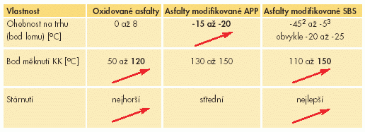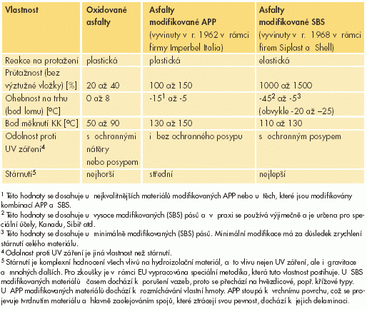 Asfaltové vodotěsné izolaceV současné době se používají tři základní druhy asfaltových vodotěsných izolací: oxidované asfalty, asfalty modifikované APP (ataktický polypropylen) a asfalty modifikované SBS (styren-butadien-styren). Asfaltové hmoty modifikované nestandardními modifikátory jsou objemově zanedbatelné. V našich klimatických podmínkách se dominantně používají materiály modifikované SBS, ale je nutné zmínit trendy zlepšování i dalších dvou druhů asfaltových materiálů. Vývojové trendyVšichni výrobci se snaží, aby se jejich materiály neustále vyvíjely, proto veškeré údaje, které jsou k dispozici, ukazují stav, který byl v době jejich sestavování. Kromě zkvalitňování vlastní asfaltové hmoty se klade důraz na zlepšování konstrukce izolačního materiálu – pásu (používáním stabilnějších vložek, odolnějších ochranných posypů, lépe zpracovatelných asfaltů atd.). Protože vložky, posypy, krycí fólie a další komponenty vyrábějí různí subdodavatelé, dochází i u nich k zlepšování parametrů. To platí zejména u výztužných vložek, kde je možno téměř libovolně upravovat napříkladprůtažnost či pevnost. Zlepšují se také kvalitativní parametry linek a snižuje se rozptyl docilovaných výsledných vlastností. K tomu dominantně přispívá moderní regulace a měření a přístrojová kontrola výroby. Tab. 1 - Přehled používaných modifikací asfaltových hmot