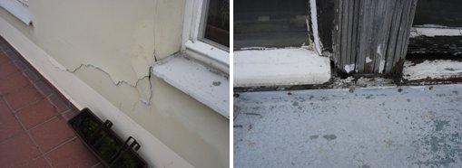Bližší průzkum však začne naznačovat další možnosti příčin zatékání. Jednou z nich je zatečení dešťových srážek do staré popraskané omítky a do parapetů na dožívajících okenních rámech.