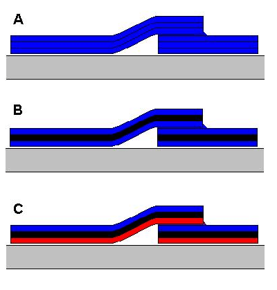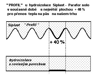 Výše uvedené problémy se spolehlivostí natavení přesahů hydroizolací se pochopitelně většinou nejdříve projeví v detailech, ale často i v ploše. Problémy s přesahy u nehomogenních hydroizolací se netýká pouze nehomogenních bitumenových pásů, ale také nehomogenních fólií, viz ukázky ve fotogalerii. Např. některé fólie, které jsou zhotoveny ze dvou vrstev, kde vrchní vrstva fólie je vyrobena z hmoty určité kvality z nových surovin a spodní vrstva fólie z recyklovaných surovin odlišné (nižší) kvality. Při kvalitně provedené pokládce bitumenových hydroizolací ovlivňují kvalitu natavení a dlouhodobou vodotěsnost jejich přesahů, vedle kvality směsi hydroizolace, pochopitelně další faktory (parametry nosné vložky, spalné fólie u přesahů, ochranný posyp u vrchních pásů u příčných přesahů, úprava spodního povrchu pásu atd.) Na našem trhu jsou k dispozici i kvalitní elastomerové bitumenové pásy, které jsou vyrobeny z homogenní směsi modifikované stabilním typem syntetického kaučuku. Některé hydroizolace mají navíc prvky, které přispívají ke spolehlivosti natavení hydroizolací jako je systém „PROFIL“ a „Rillen-vario“ u výrobků koncernu Icopal. Rýhovaný povrch na spodní straně pásu se při natavování hydroizolace zřetelně mění, což výrazně přispívá ke spolehlivému natavení hydroizolací a je velkou výhodou především při natavování přesahů pásů. Při natavování bitumenové hydroizolace je z plamene hořáku předáváno na pás poměrně velké množství tepla, což např. polyesterové nosné vložky, které se dnes u modifikovaných bitumenových pásů běžně používají příliš nesnášejí. Úprava spodního povrchu pásu systémem „PROFIL“ a „Rillen-vario,“ minimalizuje možnost poškození nosné vložky hydroizolace a minimalizuje možnost přehřátí bitumenové směsi v pásu při natavování pásů. Na podélném přesahu elastomerových bitumenových pásů bývá shora na přesahu spalná fólie zeslabená v mnoha linkách, což je další zlepšení při natavování hydroizolačních pásů, neboť se minimalizuje možnost, že nedojde v ploše přesahu pásu ke spálení spalné fólie. Některé hydroizolační pásy mívají spalnou fólii děrovanou i v ploše pásu. Schéma 1: