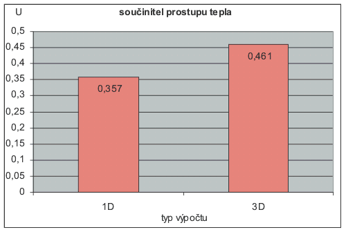 PříkladVe studovaném případě jsme ve 3D provedli výpočet tepelné propustnosti potřebné pro korektní stanovení výsledného součinitele prostupu tepla, a výpočet teplot na vnitřním povrchu konstrukce. Pro srovnání byl proveden výpočet v jednorozměrném vedení tepla bez zahrnutí vlivu tepelných mostů. Rozdíl v hodnotách součinitele prostupu tepla je patrný z grafu č.1: