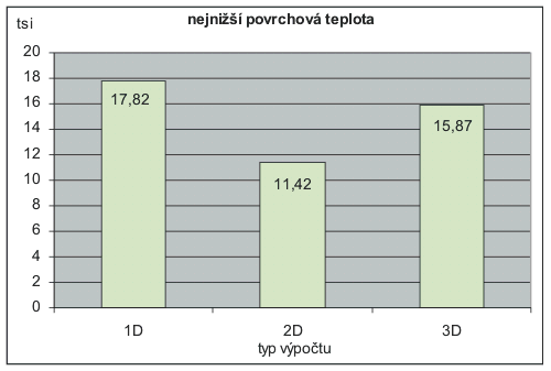 Porovnání rozdílů v hodnotách teplot na vnitřním povrchu bylo provedeno také s nekorektním výpočtem ve dvourozměrném vedení tepla, který je však bohužel častým jevem. Tímto postupem je z bodového tepelného mostu výpočtově vytvořen liniový tepelný most, hodnoty viz graf č.2: