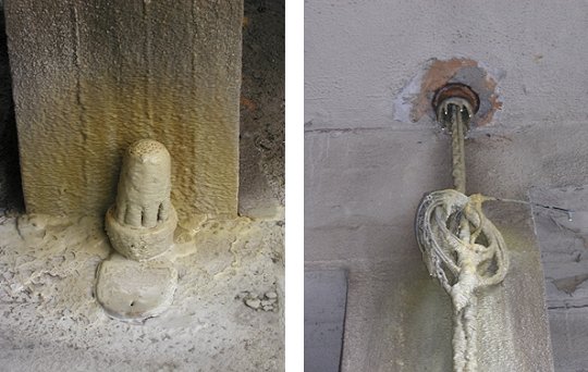 Obr. č. 6 – Ucpávání odvodňovacího systému splaveninami Porušení hydroizolačního povlaku je patrné jen v případě stěrkových hydroizolací, které jsou přímo pojížděny. Tyto hydroizolace jsou samozřejmě namáhány obrusem a je nutné doplňovat hmotu v důsledku opotřebení pojezdem. Co je velmi záludné, je schopnost těchto povlaků překlenout trhliny. Ve většině případů jsou na to velmi citlivé a jakékoliv trhliny se prorýsovávají a způsobují netěsnost konstrukce. Kromě poruch vodotěsnosti jsou i příčinou koroze výztuže a tím mohou nastat statické problémy této stavební konstrukce.