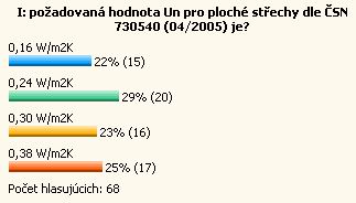 V návaznosti na nedávno publikovaný článek ke změně normy Hlasující měli možnost vybrat si ze čtyř možností, kde pouze jedna hodnota byla správná. Výsledky ankety jsou poměrně překvapivé. Správně odpovědělo necelých 30% ze všech hlasujících, zbývající hlasy byly rovnoměrně rozloženy mezi ostatní odpovědi. Podle nyní platné normy ČSN 73 0540-2, naposledy upravené v dubnu 2005, je požadovaná hodnota součinitele prostupu tepla plochou střechu rovna 0,24 W/m2K. Pokud jste hlasovali pro hodnotu 0,30 W/m2K, pak máte nejspíše v podvědomí dříve platný požadavek, který byl změnou z dubna 2005 upraven na výše zmíněnou hodnotu 0,24 W/m2K. Jestliže jste zvolili hodnotu 0,38 W/m2K, potom vězte, že se jedná o požadovanou hodnotu pro těžké stěny nebo střešní pláště se sklonem větším než 45°. Poslední možnou variantou byla hodnota Máte-li zájem o podrobnější seznámení s letošními změnami v tepelně technické normě 73 0540, pak se podívejte na příslušné články v sekci "legislativa." |