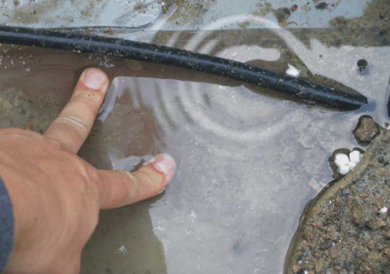 Voda stojící v izolačním souvrství. V pravé části obrázku je patrná betonová mazanina |