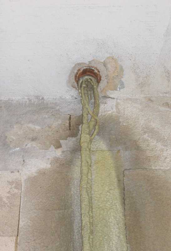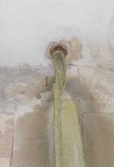 | Pohled na demontované potrubí a vpust střešního kde jsou patrné výluhy z betonu. |