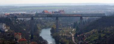 Obr. 1 Pohled na mostní provizorium přes údolí řeky Dyje (vpravo Šatov, vlevo Znojmo) Obr. 2 Jeden ze 3D modelů návrhu nového viaduktu (vlevo Znojmo, vpravo Šatov) Obr. 3 První díly OK včetně nosu pro výsun