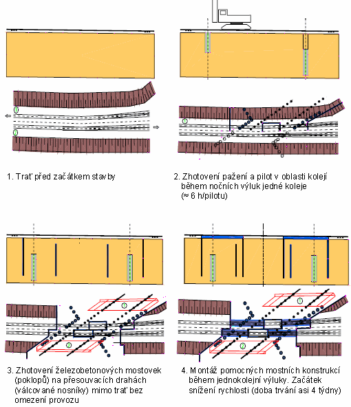 Další technologií pro železniční mosty vyvinutou kanceláří SSF je tzv. „Deckelbauweise“, volně přeloženo do češtiny – metoda poklopu na pilotách. Tato technologie navazuje na metodu příčně zasouvaného rámu a dále ji rozvíjí. Uplatňuje se zejména v následujících situacích: • Při špatných základových podmínkách, kdy plošné založení není možné. • V hustě zastavěných oblastech, bez možnosti velkých stavebních jam. • U vysoce frekventovaných tratí, kde jsou možné pouze noční výluky. • Při vysoké hladině podzemní vody. Technologie „poklopu na pilotách“ je znázorněna a popsána na následujících obrázcích.