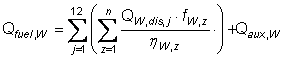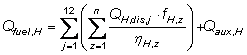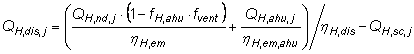 kde n je počet zdrojů tepla, QH,dis,j je měsíční spotřeba energie dodané do distribučního systému vytápění [GJ], fH,z je podíl z dodané energie připadající na z-tý zdroj tepla [-], hH,z je celková účinnost výroby tepla z-tým zdrojem tepla [-] a Qaux,H je celková roční dodaná pomocná energie na provoz čerpadel [GJ]. Měsíční spotřeba energie dodané do distribučního systému vytápění se stanoví ze vztahu: