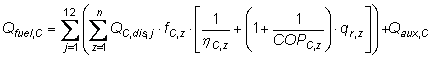 v němž QH,ht,j je potřeba tepla na pokrytí tepelné ztráty v j-tém měsíci [GJ], QH,gn,j je velikost tepelných zisků v j-tém měsíci [GJ] a hH,gn je stupeň využitelnosti tepelných zisků [-]. Všechny uvedené hodnoty se stanovují v souladu s EN 13790 a dalšími navazujícími normami. Pro spotřebu energie na chlazení Qfuel,c se používá velmi podobný přístup. Použije se vztah