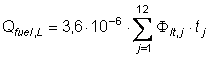 v němž QC,gn,j je velikost tepelných zisků v j-tém měsíci [GJ], QC,ht,j je celkový přenos tepla mezi interiérem a exteriérem (ztráta/zisk) v j-tém měsíci [GJ] a hC,ls je stupeň využitelnosti tepelných ztrát [-]. V případě, kdy jsou tepelné zisky QC,gn,j záporné (tj. není třeba chladit), se uvažuje i QC,nd,j = 0 a využitelné tepelné ztráty se nestanovují. Roční spotřeba energie na úpravu vlhkosti vnitřního vzduchu a na mechanické větrání Qfuel,F se stanoví jako součet měsíčních spotřeb energie na úpravu vlhkosti vnitřního vzduchu a pomocné energie na provoz ventilátorů. Používá se vztah