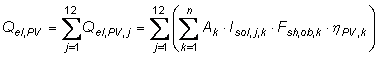 kde n je počet solárních kolektorů, Ak je plocha solárního kolektoru [m2], Isol,j,k je množství dopadající sluneční energie na k-tý kolektor v j-tém měsíci [GJ/m2], Fsh,ob,k je korekční činitel stínění k-tého kolektoru pevnými překážkami [-] a hsc,k je celková účinnost získávání energie v k-tém solárním kolektoru [-]. Celková roční produkce energie fotovoltaickými články Qel,PV se stanoví velmi podobně:
