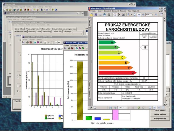 kde n je počet kogeneračních jednotek, hel,CHP,k je účinnost výroby elektřiny v k-té kogenerační jednotce [-] a Qfuel,CHP,j,k je celková spotřeba energie dodaná do k-té kogenerační jednotky v j-tém měsíci v souvislosti s jejím provozem [m2]. Detailní popis jednotlivých vztahů a jejich na ně navazujících výpočtů je možné nalézt např. na fakultních webových stránkách autora příspěvku (http://people.fsv.cvut.cz/~svobodaz/). Software Energie 2008Hodnocení energetické náročnosti budov lze sice provést podle výše popsané metodiky i ručně, ale jedná se o dosti časově náročný výpočet. Praktičtější je proto použít některý z dostupných programů. Projektanti mají zatím na výběr ze tří možností. Zcela zdarma je excelovský spreadsheet Národní kalkulační nástroj z dílny katedry TZB FSv ČVUT v Praze [2], který je možné získat přes webové stránky této katedry. Komerční programy zastupují produkty ENB firmy Protech s.r.o. [3] a Energie autora tohoto příspěvku [4]. Podívejme se ve stručnosti na druhý z nich.
