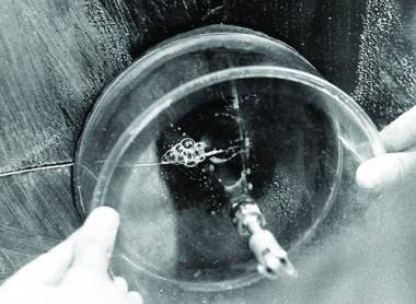popisky: Obr. 1: Hledání netěsností měřením vodivosti vrstev nad garážemi (Praha-Bohnice, 2002) Obr. 2: Vada provedení: Perforace svodu od terasové vpusti byla důsledkem „speciálního“ ukotvení termoizolace hmoždinkou přímo do okapového svodu. Vzorek po vybourání z dělicí zídky (Praha, 2004). Obr. 3: Příklad vady projektu: Neoddělená hydroizolace ochozu je níž než hladina v bazénu (Sportprojekt Praha) Obr. 4: Nevhodný materiál. Příklad degradace běžných mPVC fólií po uložení 100 dní v odpadní vodě za provozu (Léčiva Měcholupy, 1988). Obr. 5a: Již neodstranitelná konstrukce nad hydroizolací v době zjištění nevhodnosti použité hydroizolační fólie Obr 5b: Vada materiálu. Netěsnost v přesahu zjištěná vakuovou zkouškou. Obr. 5c: Problém netěsnosti hran u podélně propustných pásů jako Vindol duo a rohoží s bentonitem Obr. 6: Pás s bentonitem složený mj. ze dvou podélně vodopropustných vrstev (vlevo stav po nasáknutí vodou). Obr. 7: Opravované trhliny nátěru CONIPUR, použitého na pojezdnou plochu parkoviště – dva roky po provedení (2009)