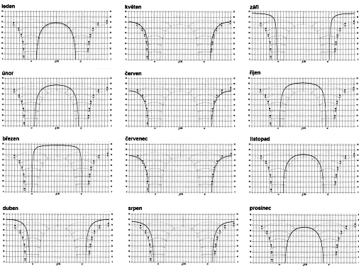 Zasklení Zvolené zasklení má solární faktor 36%, tzn. celková propustnost sluneční energie je 36%. Činitel prostupu světla tímto zasklením je 0,46, kromě prostupu sluneční energie je tedy značně snížen i prostup světla. Slunolamy Pro správný návrh slunolamů je zapotřebí uvědomit si polohu slunce nad obzorem pro jednotlivé orientace fasády a pro jednotlivá roční období. Objekt se nachází na rovníku, je tedy zapotřebí počítat s faktem, že půl roku slunce svítí ze severu, půl roku z jihu. Výška slunce nad obzorem je po celý rok téměř vyrovnaná, doba přímého slunečního svitu je také během celého roku prakticky shodná. Doba oslunění a dráha slunce na obloze je patrná z následujícího obr. č. 1.  Obr. 1 Dráha slunce pro jednotlivé měsíce. Z průběhu slunečních drah je patrné, že východ i západ slunce je poměrně rychlý, po celý rok se slunce pohybuje poměrně vysoko nad zenitem. Z toho vyplývá, že ideálním pasivním stínicím prostředkem je horizontální slunolam a to víceméně po celém obvodu budovy. Z architektonického hlediska byl v případě řešené budovy zvolen slunolam s proměnnou hloubkou vyložení. Účinnost slunolamu ve vybraném místě na jižní fasádě s největší hloubkou jeho vyložení je patrná z následujících obr. č. 2.  Obr. 2 Účinnost vodorovného slunolamu.