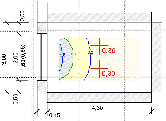 Obrázek 4: Místnost stíněná zástavbou výšky H = 45 m
