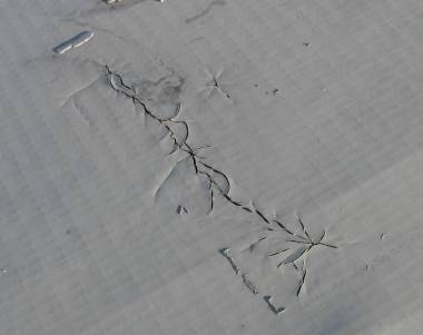 Poruchy, které jsou představeny v tomto článku, se netýkají jedné unikátní fólie, jednoho unikátního výrobce a jedné unikátní stavby. Jedná se o obecný fenomén, který je nutno evidovat a bát se ho. Žijeme v problematické době, kdy máme dostatečné množství informací, známe mechanismy chování hydroizolací a přesto se vždy najde někdo, kdo nezodpovědně hazarduje s důvěrou v materiály, ale i v celou skupinu výrobků. Pohybujeme se ve vlnách, v určitém období jsou v nemilosti asfaltové hydroizolace a v dalším období jsou to fólie. Kromě marketingu konkurenční technologie se vždy vyskytuje nějaký objektivní důvod, kdy na čas určitý materiál historici znemožní. Syntetické fólie stárnou stejně tak jako všechny ostatní hydroizolační materiály, toto stárnutí se projevuje ztrátou elasticity, plasticity, resp. ztrátou schopnosti protažení (při různých příležitostech), v kombinaci se snížením teploty lámavosti. To jsou základní charakteristiky procesu stárnutí. Šetření výrobců v některých případech je velmi riskantní, tj. to nejlevnější, co je na trhu, je vždy nejriskantnější. Nejporuchovější. Následující článek se bude zabývat velmi záludnou vadou, která je někdy popisována jako efekt aktivního uhlí, v jiných případech se nazývá mikrobiologickou korozí. Principiálně se jedná o stejný efekt, kdy lokálně migrují změkčovadla z fólií, které pak nekontrolovatelně a náhodně praskají jednotlivými nebo skupinovými rozprasky. S časem se tyto rozprasky zahušťují. Všichni známe princip plynových masek, kde filtry jsou z aktivního uhlí, které má tendenci absorbovat Ch (chlór). Tento efekt není časově určen, začíná po roce, ale někdy i po pěti letech, jedná se o kombinaci řady vlivů, které kombinují a na základě toho vytváří rychlejší nebo pomalejší proces tohoto typu stárnutí. Tento proces je též popsán v knize „Poruchy střech“, kterou napsal W. Holzapfel, byla přeložena a vyšla u nakladatelství JAGA. Samozřejmě, že kromě tohoto efektu obsahuje kniha obrovské množství příkladů poruch materiálů a konstrukcí plochých a šikmých střešních plášťů, včetně důsledků a včetně návrhů na opatření, rekonstrukce, opravy. Kniha byla napsána v Německu, proto některé postupy korespondují s německým systémem a my bychom si dokázali přestavit i jiné možnosti nebo jiné varianty. Velmi potěšitelné však je, že všude kolem nás, ale nejen v Čechách, se vyskytují vady, poruchy, problémy, lidská neznalost a v některých případech i ignorace zkušeností a znalostí. Fólie jsou velmi záludný materiál, kde vnějškově lze rekognoskovat jen velmi málo. Je to problém kompozice, směsi materiálu, kde je jen velmi těžko možno rozeznat, zda chemické složení PVC je korektní, nebo zda ve směsi něco přebývá a naopak něco chybí. Jedním ze zjištění, která nejsou plně publikována, je množství plniv, které se ve fóliích vyskytuje. Křída, která slouží jako toto plnivo, je samozřejmě levnější než hmota PVC, proto řada firem experimentovala a i teď experimentuje jaké je množství tohoto plniva ve hmotě. Obecně lze říci, že když je toto plnivo v objemu vyšším než 10 %, dojde velmi pravděpodobně k těžkostem při spojování, svařování spoje je nutné velmi často kontrolovat, chybovost je velmi vysoká. Setkal jsem se i fóliemi, které měly množství plniva v horizontu 18 %. Jejich spoje prakticky nedržely a ihned po zchladnutí se spoj fólie delaminoval již pod lehkým ručním nátlakem. Obr. č. 2, 3 – Schémata struktury PVC Tyto dva obrázky ukazují strukturu PVC. Zejména z 3D schématu je jasné, že když se cokoliv přežene nebo, když hmota neobsahuje byť malý komponent, retardér, může dojít k dramatickým důsledkům, zejména porušení řetězce, který přestane, lokálně nebo plošně plnit svojí funkci, nastartuje se proces stárnutí, ztráty technických vlastností. Typickým projevem mikrobiologické koroze jsou následující obrázky. Jsou pořízeny na několika stavbách a u několika prováděcích firem. Tj. není to unikátní porucha, bohužel je to porucha, která je relativně častá. Jejím důsledkem je samozřejmě porušení vodotěsnosti syntetické fólie a zatékání do střešního pláště a s tím spojené další potíže zejména užívání.. K obdobnému porušování fólií dochází v případě syntetických fólií, které nemají dostatečnou životnost a jsou porušeny kroupami. Každá fólie by měla mít testy na proražení kroupami. Přesný název je „Odolnost proti krupobití“ zkušební metodu řeší EN 13583, Základní specifikace, kde se nachází tyto údaje a samozřejmě další je EN 13956. Tedy, když shrnu, co je důsledkem mikrobiologické koroze, efektu aktivního uhlí, tak to je ztráta technických vlastností, ale též výrazné snížení odolnosti proti krupobití, ale současně mechanického poškození při běžné údržbě. Tady je velké nebezpečí, pro konečného uživatele, že pojišťovna by nemusela hradit škody způsobené kroupami, když by bylo prokázáno, že poškozená hydroizolační fólie vykazovala zrychlené stárnutí právě v důsledku výše uvedeného efektu. Pár dokumentačních fotografií ukazující typické projevy tohoto efektu. Obr. č. 4 – Schéma praskliny s jednotlivými vývojovými stupni a) Výrazně patrná prohlubeň b) Jádro poruchy c) Prasklina ve fólii d) Výrazně patrná prohlubeň e) Počáteční stádium – vizuálně patrná prohlubeň Obr. č. 5 – Celkový pohled na úžlabí, kde je hydroizolační povlak porušen tímto způsobem, řada míst je již opravena záplatami. Velká většina používaných fólií jsou plastomery, tj. jejich tvarové změny jsou obvykle 