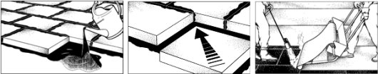 Velmi důležité je dodržení důsledné kompaktnosti celé skladby, které je docíleno vzájemným slepením všech vrstev horkým asfaltem. Pěnové sklo je celoplošně lepeno na podklad (v případě zatížených střech většinou betonový) do lože horkého asfaltu, spáry mezi jednotlivými deskami pěnového skla jsou zalepeny asfaltem a hydroizolační vrstva je celoplošně nalepena nebo navařena na asfaltem zatřený povrch pěnového skla (viz obr. 3).