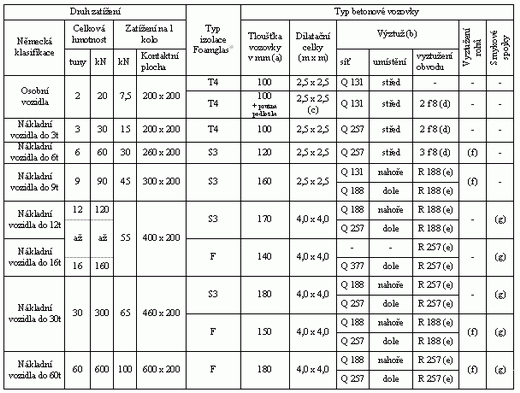 Poznámky k tabulce 2: (a) Výpočty jsou provedeny pro vozovky z betonu s pevností 35 MPa po 28 dnech. (b) Popis výztužných sítí je uveden v tabulce 3. (c) Rozdilatovaná vozovka je uložena na akustických gumových rohožích s tlumící charakteristikou Ks = 100MPa. (d) Jedná se o tyčovou výztuž umístěnou na výztužných sítích po obvodě dilatačních celků vozovky. (e) Standardní výztužné sítě ohnuté do tvaru U. (f) Dodatečné čtverce výztužných sítí umístěné v rozích dilatačních celků vozovky. (g) Pro velmi zatížené vozovky je doporučeno provedení smykových spojek mezi dilatačními celky vozovky.
